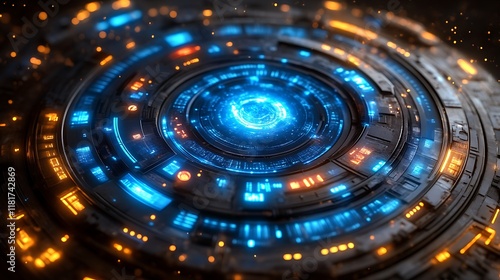 Fototapeta premium Futuristic circular tech interface with glowing blue core.