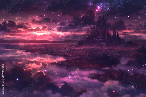 Fototapeta premium Futuristic City Above Clouds Under Starry Sky