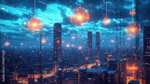 Fototapeta premium Futuristic city at twilight with glowing orbs