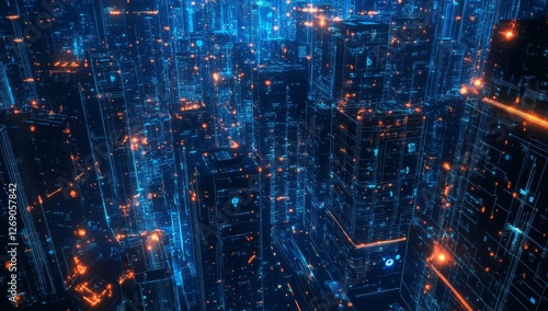 © POV Studio, Naklejka premium Futuristic city data streams night aerial digital