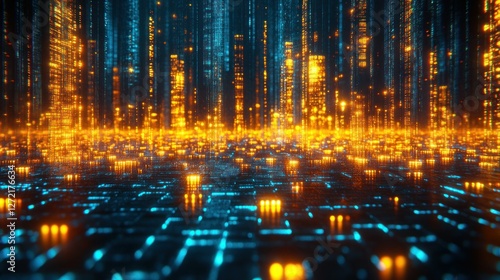 Obraz premium Futuristic city, digital rain, glowing network, abstract background, tech concept