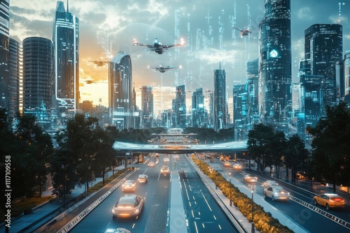 Naklejka premium Futuristic city, flying vehicles, highway traffic.