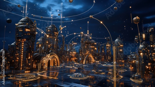 © Falfa, Fototapeta premium Futuristic city, night, floating structures, technological