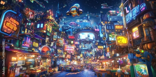 © novian, Obraz premium Futuristic City Night Market Vibrant Street Scene