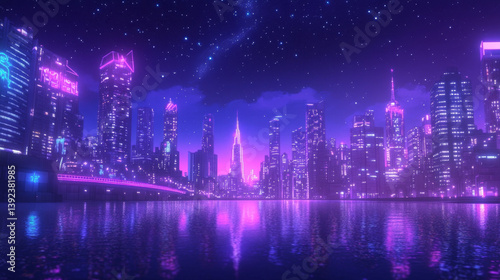 Fototapeta premium Futuristic City Nightscape Neon Lights Skyline Reflection Water