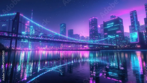 © AndiAzis, Naklejka premium Futuristic City Nightscape with Illuminated Bridge and Neon Lights