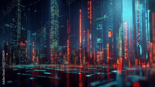 © Anuphong, Fototapeta premium Futuristic City Nightscape with Vibrant Neon Lights and Rain