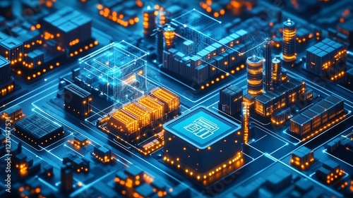 © Asih, Fototapeta premium Futuristic city on a circuit board, showcasing technological infrastructure and data flow.