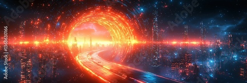 Obraz premium Futuristic city road enters glowing portal