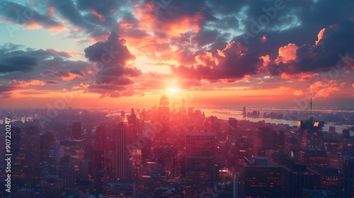 Fototapeta premium Futuristic City Skyline at Dramatic Sunset,Showcasing Technological Progress and Urban Innovation