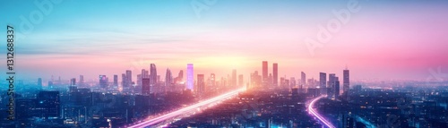 © LIPO@SEXTAO22, Fototapeta premium Futuristic city skyline at dusk, glowing in soft blue and purple hues, AI traffic moving smoothly