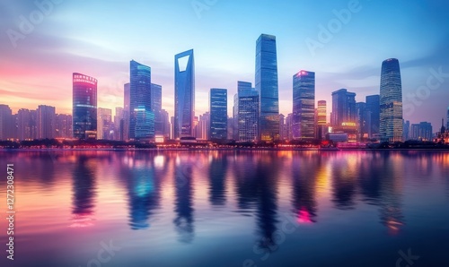 Obraz premium Futuristic city skyline at dusk with glowing skyscrapers, reflections...
