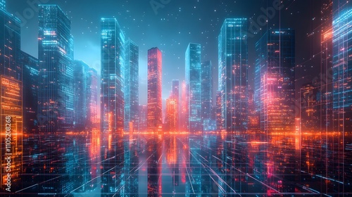 Obraz premium Futuristic city skyline at night, glowing neon lights reflecting on a glassy surface.