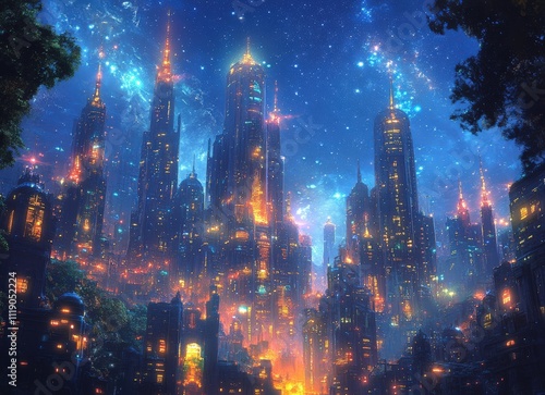 Fototapeta premium Futuristic city skyline at night, glowing skyscrapers under a vibrant starry sky. Digital art, fantasy architecture, urban scene.