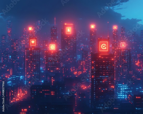 © Mai, Fototapeta premium Futuristic city skyline at night, illuminated by vibrant neon lights and digital icons representing technology.