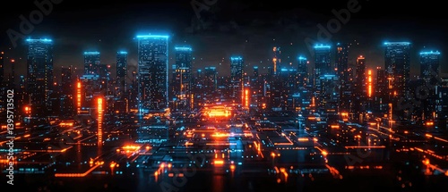 Obraz premium Futuristic city skyline at night, illuminated with vibrant orange and blue...
