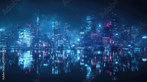 Obraz premium Futuristic city skyline at night reflected in water.