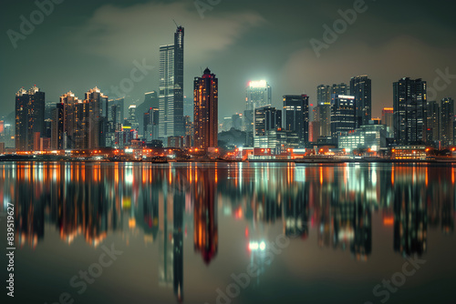 Obraz premium Futuristic City Skyline at Night Reflected in Water