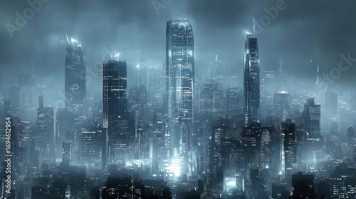 Obraz premium Futuristic city skyline at night, shrouded in mist