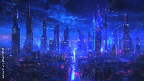 Obraz premium Futuristic city skyline at night, vibrant neon lights, cityscape, aerial view, stock photo