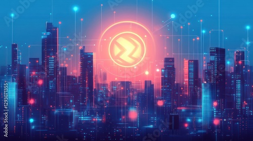 © lestari, Obraz premium Futuristic city skyline at night with glowing digital network connections and abstract symbol.