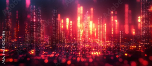 Obraz premium Futuristic city skyline at night with glowing red lights and blurred background.