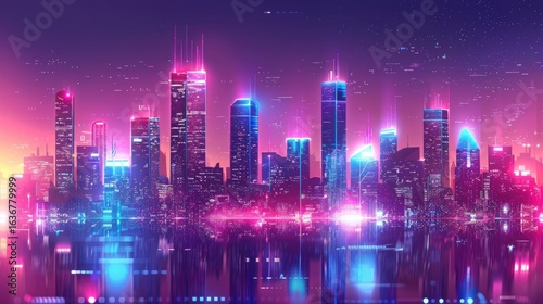 Fototapeta premium Futuristic city skyline at night with vibrant neon lights reflecting on...