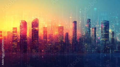 © Khoirur, Fototapeta premium Futuristic city skyline at sunrise