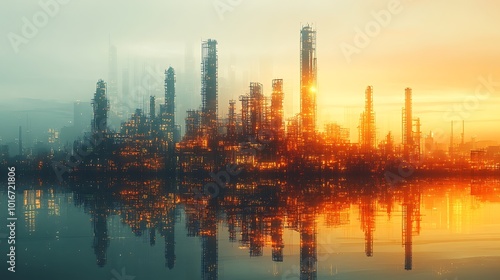 Naklejka premium Futuristic city skyline at sunrise with reflection in water.