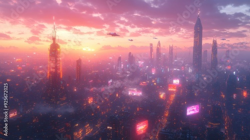 © BOJOShop, Fototapeta premium Futuristic City Skyline at Sunset.