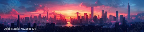 © Alexey, Fototapeta premium Futuristic City Skyline at Sunset with Beautiful Pastel Hues. Generative AI