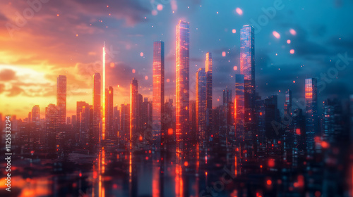 © Atmospheric stock, Fototapeta premium Futuristic city skyline at sunset with illuminated skyscrapers and vibrant colors