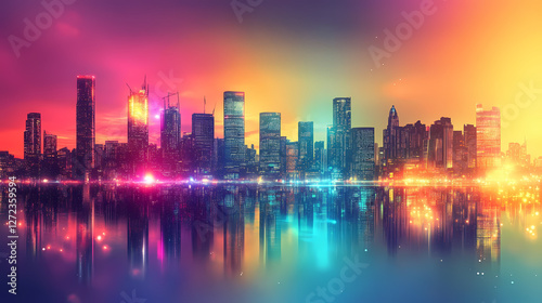 © Thiago, Fototapeta premium Futuristic city skyline at sunset with neon lights and colorful reflections. Neon Dreamscape City. Illustration