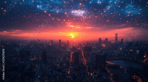 © afif, Fototapeta premium Futuristic city skyline at sunset with network connections