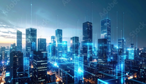 © Rian, Obraz premium Futuristic city skyline at twilight