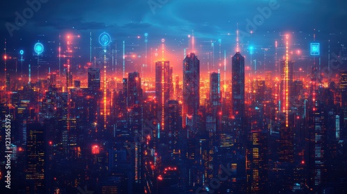 © Almahyra, Fototapeta premium Futuristic city skyline, data streams, night, innovation, technology