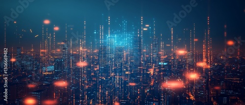 Fototapeta premium Futuristic city skyline, digital data streams, glowing lights, night