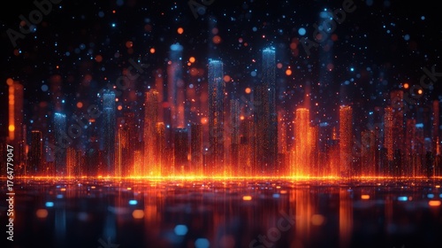 Fototapeta premium Futuristic city skyline, glowing orange and blue, particle effects