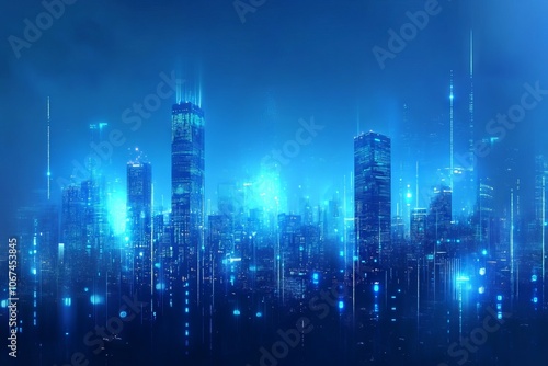© Olena Roze, Obraz premium Futuristic city skyline illuminated at night, showcasing sound waves and data visualizations in a blue color theme. AI generated illustration