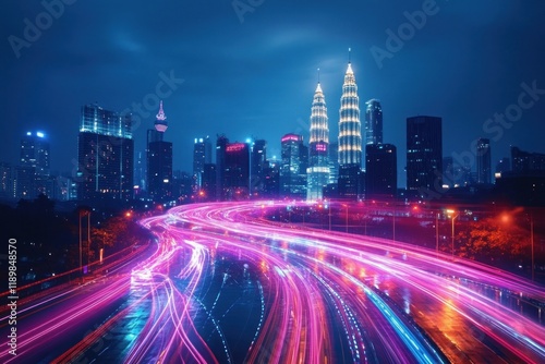 © btiger, Obraz premium Futuristic City Skyline Nighttime Connection Technology Concept with Neon Lights and Light Trails