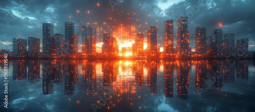 Fototapeta premium Futuristic city skyline reflected in water at sunset with fiery particles.