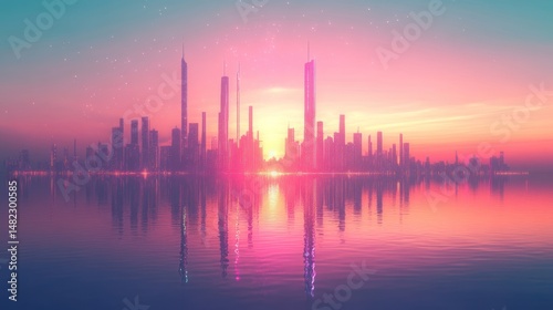 © Robani, Fototapeta premium Futuristic city skyline reflected on water at sunset