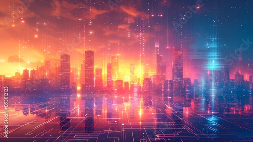 © Pixels , Fototapeta premium Futuristic city skyline with angular buildings in metallic tones, glowing against a digital grid sky