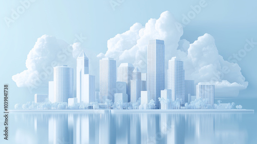 Fototapeta premium Futuristic city skyline with clouds reflecting on water