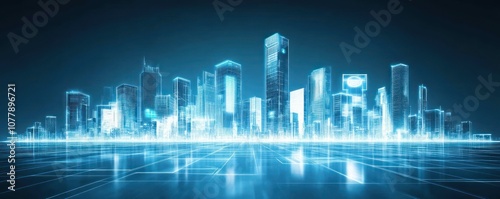 Fototapeta premium Futuristic city skyline with digital elements, representing technology and innovation.