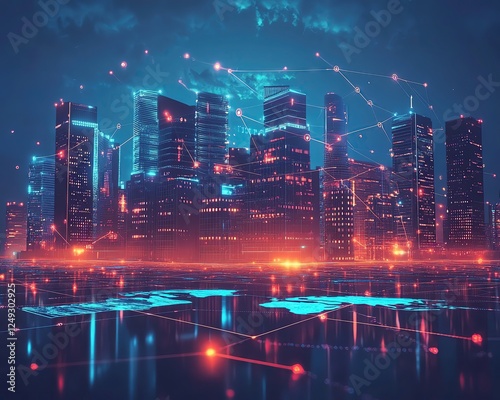 Fototapeta premium Futuristic city skyline with digital overlay.
