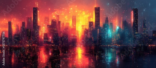 © Mega, Naklejka premium Futuristic City Skyline with Fiery Fireworks Display