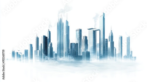 Naklejka premium Futuristic city skyline with glass buildings shrouded in mist at dawn