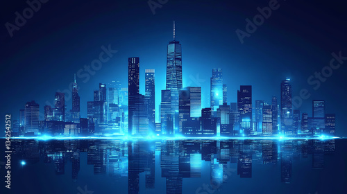 © pim, Obraz premium Futuristic city skyline with glowing blue lights reflecting in water at night.