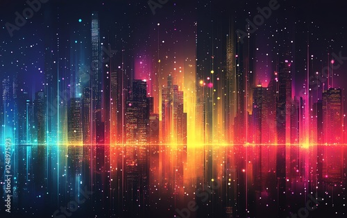Obraz premium Futuristic city skyline with glowing buildings and digital network connections, symbolizing smart city connectivity, vibrant colors, sleek and modern design